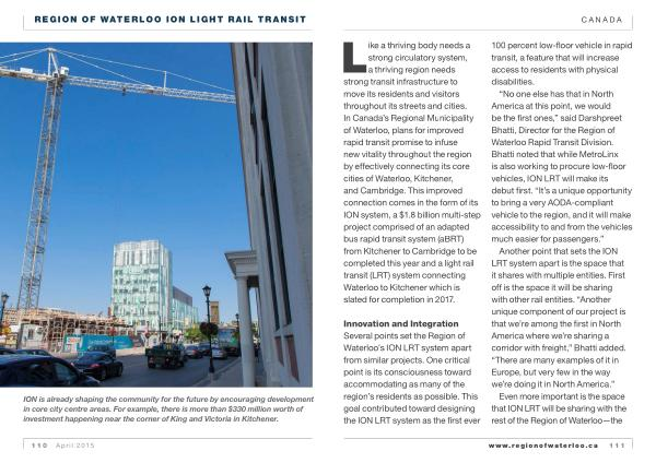Like a thriving body needs a strong circulatory system , a thriving region needs strong transit infrastructure to move its residents and visitors throughout its streets and cities . In Canada ’ s Regional Municipality of Waterloo , plans for improved rapid transit promise to infuse new vitality throughout the region by effectively connecting its core cities of Waterloo , Kitchener , and Cambridge . This improved connection comes in the form of its ION system , a $ 1.8 billion multi-step project comprised of an adapted bus rapid transit system ( aBRT ) from Kitchener to Cambridge to be completed this year and a light rail transit ( LRT ) system connecting Waterloo to Kitchener which is slated for completion in 2017 .