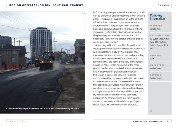 According to Bhatti , benefits of rapid transit development even reach the Region of Waterloo ’ s rural residents . “ Finally , by having all of this investment within the urban cores and protecting the suburbs , we also by default protect the farmlands that are at the periphery of the region ,” he added . “ Our region has some of the most productive farmlands in the Golden Horseshoe , and we also rely on groundwater reserves — this region is one of the very few midsized communities that rely on groundwater . We need to make sure we protect those sensitive areas that provide a very viable water solution for us . If we allow urban sprawl to continue without having management tools , then those will be impacted .” By intensification of chosen city corridors , supported by strong utilities like rapid transit , sprawl is contained — ultimately supporting a better future for every resident of Waterloo .