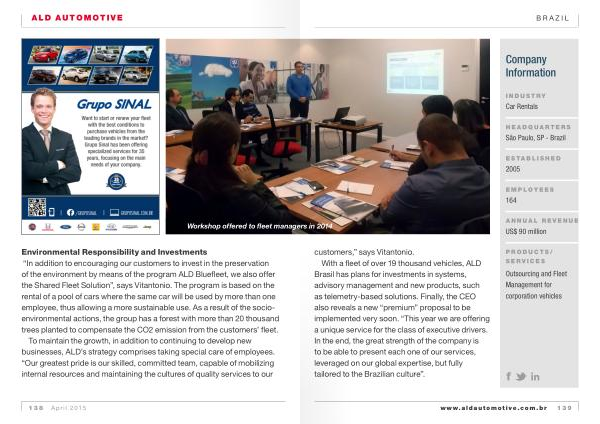 With a fleet of over 19 thousand vehicles , ALD Brasil has plans for investments in systems , advisory management and new products , such as telemetry-based solutions . Finally , the CEO also reveals a new “ premium ” proposal to be implemented very soon . “ This year we are offering a unique service for the class of executive drivers . In the end , the great strength of the company is to be able to present each one of our services , leveraged on our global expertise , but fully tailored to the Brazilian culture ”.