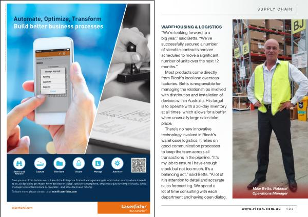 There ’ s no new innovative technology involved in Ricoh ’ s warehouse logistics . It relies on good communication processes to keep the team across all transactions in the pipeline . “ It ’ s my job to ensure I have enough stock but not too much . It ’ s a balancing act ,” said Betts . “ A lot of it is attention to detail and accurate sales forecasting . We spend a lot of time consulting with each department and having open dialog . Mike Betts , National Operations Manager