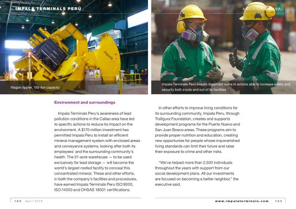 Impala Terminals Peru ’ s awareness of lead pollution conditions in the Callao area have led to specific actions to reduce its impact on the environment . A $ 170 million investment has permitted Impala Peru to install an efficient mineral management system with enclosed areas and conveyance systems , looking after both its employees ’ and the surrounding community ’ s health . The 31-acre warehouse — to be used exclusively for lead storage — will become the world ’ s largest roofed facility to conceal this concentrated mineral . These and other efforts , in both the company ’ s facilities and procedures , have earned Impala Terminals Peru ISO : 9000 , ISO : 14000 and OHSAS 18001 certifications .