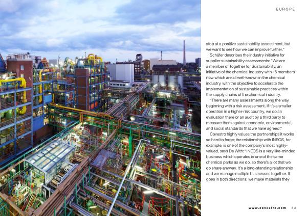 Covestro highly values the partnerships it works so hard to forge ; the relationship with INEOS , for example , is one of the company ’ s most highlyvalued , says De With : “ INEOS is a very like-minded business which operates in one of the same chemical parks as we do , so there ’ s a lot that we do share anyway . It ’ s a long-standing relationship and we manage multiple businesses together . It goes in both directions ; we make materials they