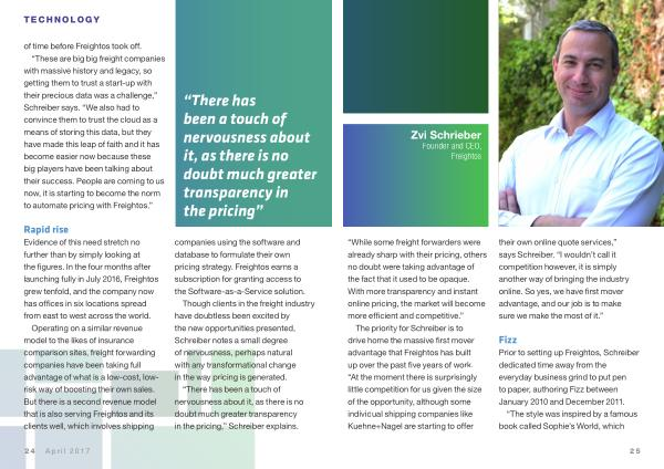 The priority for Schreiber is to drive home the massive first mover advantage that Freightos has built up over the past five years of work . “ At the moment there is surprisingly little competition for us given the size of the opportunity , although some individual shipping companies like Kuehne + Nagel are starting to offer