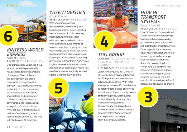 COUNTRY JAPAN REVENUES 2015 $ 5.61 BILLION Hitachi Transport Systems is well known for its all-encompassing logistics outsourcing covering procurement , production , sales and distribution , and after service . Other aspects of the business cover heavy transport and freight forwarding , as well as a range of sector-specific solutions . According to reporting from Nikkei Asia , the company has improved efficiency in order to consolidate during the global shipping downturn , citing the use of artificial intelligence for a 7 percent pre-tax earnings growth .