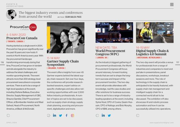 The event offers insights from over 45 Gartner experts behind the latest supply chain research . Set over four days , the conference will provide researchbacked sessions , expert advice on specific challenges and also allow networking opportunities with over 2,500 fellow industry professionals . A number of topics are set to be discussed , such as supply chain strategy , supply chain planning , sourcing and procurement , digitalisation and more . APRIL 2020