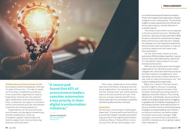 Automation On the topic of automation , Deshpande states that : “ A recent poll found that 63 % of procurement leaders consider automation a key priority in their digital transformation initiatives . Many of these efforts involve the use of AI-driven technologies , such as machine learning and predictive analytics . These technologies help organisations analyse a large amount of data quickly . The resulting insights increase operational cost-efficiencies while responding to market demand in a nimble manner .