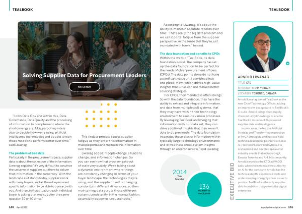 Arnold Liwanag joined TealBook as the new Chief Technology Officer , adding an impressive background to TealBook ’ s C-suite . Arnold brings deep supply chain industry knowledge to enable TealBook ’ s mission of AI-powered supplier data and intelligence .