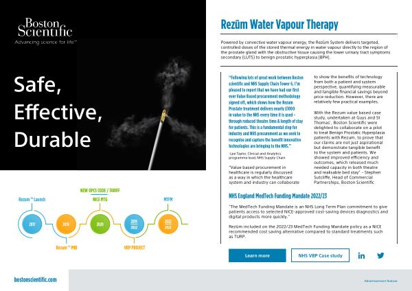 Rezūm included on the 2022 / 23 MedTech Funding Mandate policy as a NICE recommended cost saving alternative compared to standard treatments such as TURP .
