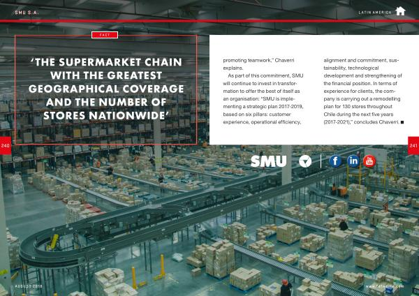As part of this commitment , SMU will continue to invest in transformation to offer the best of itself as an organisation : “ SMU is implementing a strategic plan 2017-2019 , based on six pillars : customer experience , operational efficiency , alignment and commitment , sustainability , technological development and strengthening of the financial position . In terms of experience for clients , the company is carrying out a remodelling plan for 130 stores throughout Chile during the next five years ( 2017-2021 ),” concludes Chaverri .
