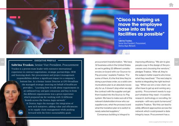 EXECUTIVE PROFILE Sabrina Traskos , Senior Vice President , Procurement Traskos is a proven team leader with extensive international experience in contract negotiations , strategic partnerships , OEM and licensing deals . Her procurement and project management responsibilities deliver a significant impact to a company ’ s bottom line . As a former Senior Director at GPO Broadlane she managed strategic sourcing on behalf of healthcare providers ... “ Learning how to talk about requirements in an unbiased way and gain consensus and buy-in from the different organizations was a great experience which prepared me for working with 32 different brands across the Dentsu Aegis network .” At Dentsu Aegis she manages the integration of new tech initiatives , adding value and efficiencies to its supply chain management while pushing forward with the firm ’ s sustainability goals .