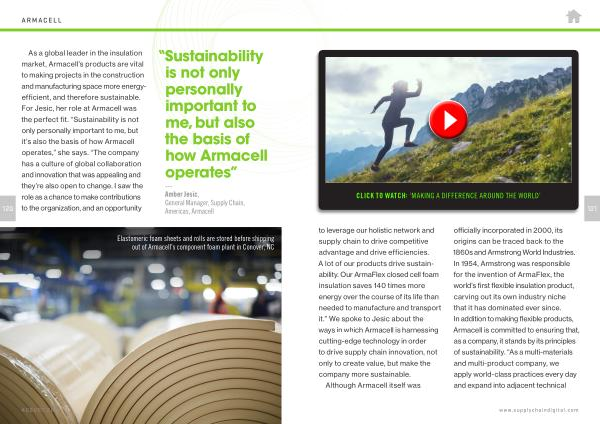 CLICK TO WATCH : ‘ MAKING A DIFFERENCE AROUND THE WORLD ’ 121 to leverage our holistic network and supply chain to drive competitive advantage and drive efficiencies . A lot of our products drive sustainability . Our ArmaFlex closed cell foam insulation saves 140 times more energy over the course of its life than needed to manufacture and transport it .” We spoke to Jesic about the ways in which Armacell is harnessing cutting-edge technology in order to drive supply chain innovation , not only to create value , but make the company more sustainable .