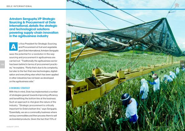 A s Vice President for Strategic Sourcing and Procurement at fruit and vegetable giant Dole International , Arindam Sengupta sees the potential for a revolution in the way sourcing and procurement in agribusiness are carried out . “ Traditionally the agribusiness sector has been behind in terms of procurement practices ,” he explains . “ Partly that ’ s due to its complexity , but also to the fact that new technologies , digitalisation and everything else which has been applied in other industries has not been as developed on the agribusiness side .”