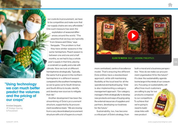 CLICK TO WATCH : DOLE – GROWING PINEAPPLES 135 more centralised , centre of excellence model . That ’ s ensuring the different Dole entities have a standardised approach , while still maintaining flexibility at the local level for all the operational and tactical buying .” Dole is also implementing a category management approach . “ Our category managers think strategically to develop new products and ways of buying using the external resources of suppliers and partners , developing our business for the future .”