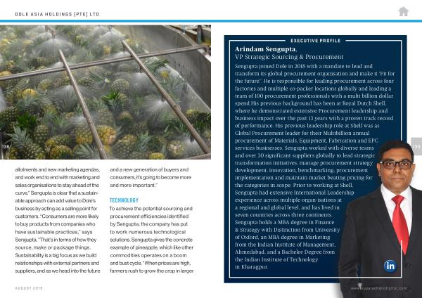 Sengupta joined Dole in 2018 with a mandate to lead and transform its global procurement organisation and make it ‘ Fit for the future ”. He is responsible for leading procurement across four factories and multiple co-packer locations globally and leading a team of 100 procurement professionals with a multi billion dollar spend . His previous background has been at Royal Dutch Shell , where he demonstrated extensive Procurement leadership and business impact over the past 13 years with a proven track record of performance . His previous leadership role at Shell was as Global Procurement leader for their Multibillion annual procurement of Materials , Equipment , Fabrication and EPC services businesses . Sengupta worked with diverse teams and over 30 significant suppliers globally to lead strategic transformation initiatives , manage procurement strategy development , innovation , benchmarking , procurement implementation and maintain market beating pricing for the categories in scope . Prior to working at Shell , Sengupta had extensive International Leadership experience across multiple organ-isations at a regional and global level , and has lived in seven countries across three continents . Sengupta holds a MBA degree in Finance & Strategy with Distinction from University of Oxford , an MBA degree in Marketing from the Indian Institute of Management , Ahmedabad , and a Bachelor Degree from the Indian Institute of Technology in Kharagpur .