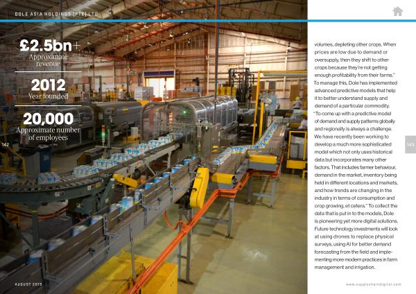 volumes , depleting other crops . When prices are low due to demand or oversupply , then they shift to other crops because they ’ re not getting enough profitability from their farms .” To manage this , Dole has implemented advanced predictive models that help it to better understand supply and demand of a particular commodity . “ To come up with a predictive model of demand and supply patterns globally and regionally is always a challenge . We have recently been working to develop a much more sophisticated model which not only uses historical data but incorporates many other factors . That includes farmer behaviour , demand in the market , inventory being held in different locations and markets , and how trends are changing in the industry in terms of consumption and crop growing , et cetera .” To collect the data that is put in to the models , Dole is pioneering yet more digital solutions . Future technology investments will look at using drones to replace physical surveys , using AI for better demand forecasting from the field and implementing more modern practices in farm management and irrigation .