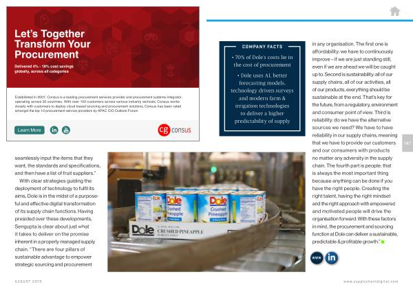 With clear strategies guiding the deployment of technology to fulfil its aims , Dole is in the midst of a purposeful and effective digital transformation of its supply chain functions . Having presided over these developments , Sengupta is clear about just what it takes to deliver on the promise inherent in a properly managed supply chain . “ There are four pillars of sustainable advantage to empower strategic sourcing and procurement