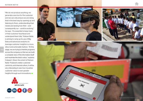 “ We do not produce anything ; we generate a service for the customer and we can only ensure we are doing that in the best way by opening up and listening to them , understanding their needs and seeing how their – and consequently our – world is evolving ,” he says . “ It ’ s essential to keep track of that customer heartbeat and understand them fully .” Katoen Natie is aiming to ramp up its use of Big Data and advanced analytics to leverage customer insights in a more direct and actionable fashion . “ At this stage , we are trying to interlink programs across the company so that we can build a complete view of the information itself and maximise the data ’ s value ,” explains Colpaert . Given the extent of Katoen Natie Thailand ’ s stellar customer centricity and internal culture , it will be very interesting to see how it pushes customer value to even greater heights through such innovations . AUGUST 2019