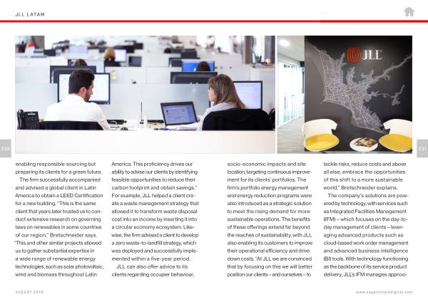 231 socio-economic impacts and site location , targeting continuous improvement for its clients ’ portfolios . The firm ’ s portfolio energy management and energy reduction programs were also introduced as a strategic solution to meet the rising demand for more sustainable operations . The benefits of these offerings extend far beyond the reaches of sustainability , with JLL also enabling its customers to improve their operational efficiency and drive down costs . “ At JLL we are convinced that by focusing on this we will better position our clients – and ourselves – to tackle risks , reduce costs and above all else , embrace the opportunities of this shift to a more sustainable world ,” Bretschneider explains .