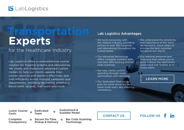 Lab Logistics offers a comprehensive courier solution for hospital systems and laboratories . We create and implement advanced custom models to help our clients operate their courier services and logistics effectively and cost-efficiently across multiple campuses and departments , including laboratory , pharmacy , blood bank , records , mail room and more .