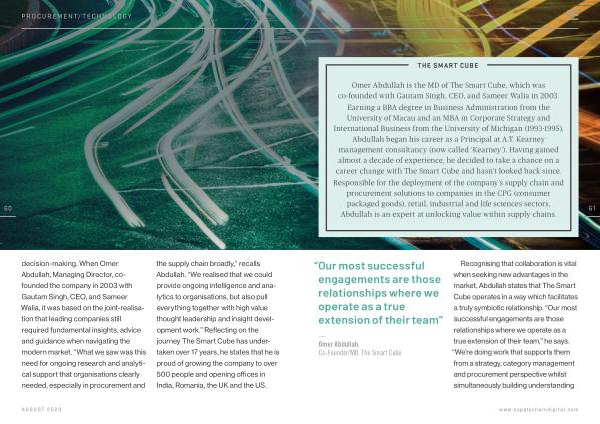 Recognising that collaboration is vital when seeking new advantages in the market , Abdullah states that The Smart Cube operates in a way which facilitates a truly symbiotic relationship . “ Our most successful engagements are those relationships where we operate as a true extension of their team ,” he says . “ We ’ re doing work that supports them from a strategy , category management and procurement perspective whilst simultaneously building understanding