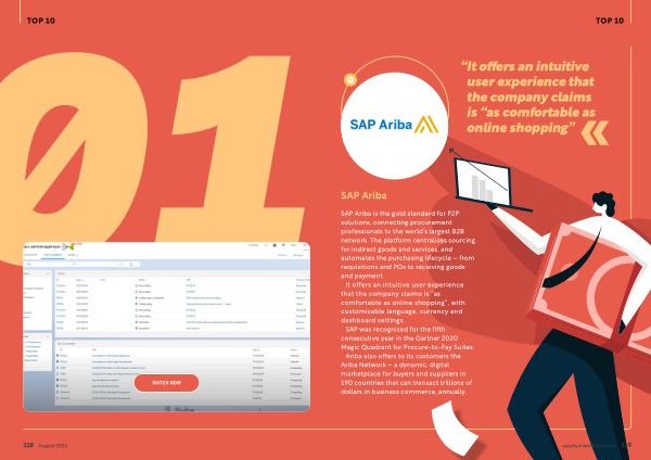 SAP Ariba is the gold standard for P2P solutions , connecting procurement professionals to the world ’ s largest B2B network . The platform centralises sourcing for indirect goods and services , and automates the purchasing lifecycle – from requisitions and POs to receiving goods and payment . It offers an intuitive user experience that the company claims is “ as comfortable as online shopping ”, with customisable language , currency and dashboard settings . SAP was recognised for the fifth consecutive year in the Gartner 2020 Magic Quadrant for Procure-to-Pay Suites . Ariba also offers to its customers the Ariba Network – a dynamic , digital marketplace for buyers and suppliers in 190 countries that can transact trillions of dollars in business commerce , annually .