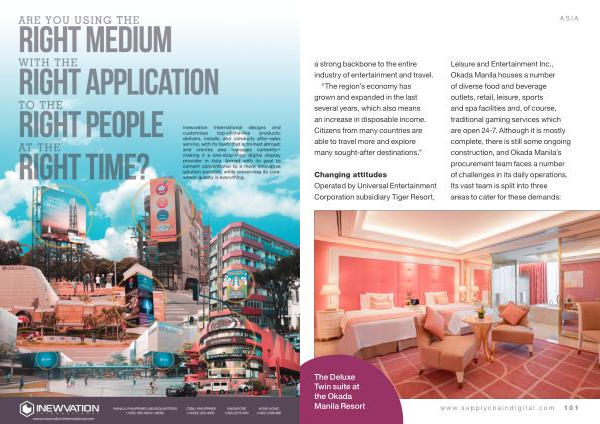 Leisure and Entertainment Inc ., Okada Manila houses a number of diverse food and beverage outlets , retail , leisure , sports and spa facilities and , of course , traditional gaming services which are open 24-7 . Although it is mostly complete , there is still some ongoing construction , and Okada Manila ’ s procurement team faces a number of challenges in its daily operations . Its vast team is split into three areas to cater for these demands :