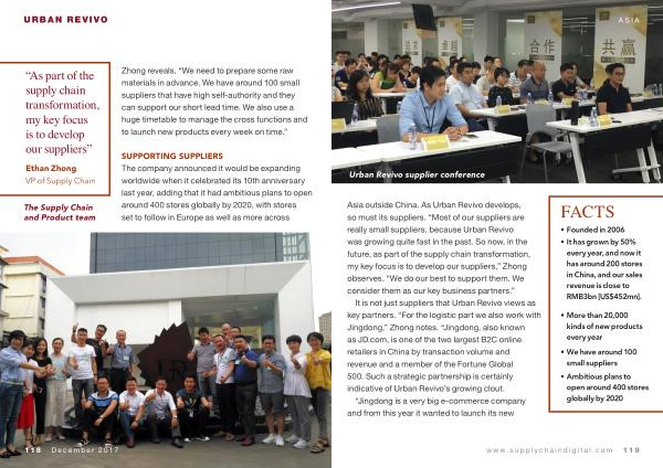 Asia outside China . As Urban Revivo develops , so must its suppliers . “ Most of our suppliers are really small suppliers , because Urban Revivo was growing quite fast in the past . So now , in the future , as part of the supply chain transformation , my key focus is to develop our suppliers ,” Zhong observes . “ We do our best to support them . We consider them as our key business partners .”