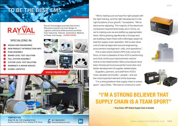 “ We ’ re making sure we have the right people with the right training , and the right development in the right locations of our growth ,” he explains . “ We ’ ve done some adjusting . The majority of the electronic component requirements today are in China , so we ’ re making sure we are staffed up appropriately there . We ’ re growing significantly in Europe and are building a team there with a Michigan expert to lead the supply chain operation . We ’ ve also done a lot of internal alignment around engineering , procurement management , cells , and operations .” This is also where Zerbe ’ s KPIs fully come into force , to track a baseline of how A123 is performing and what continuous improvements need to evolve or be implemented . Many procedures have been introduced to ensure perfect execution and better development of supplier relationships .