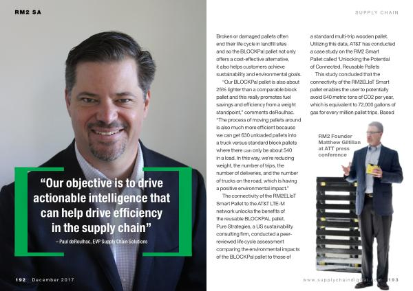 The connectivity of the RM2ELIoT Smart Pallet to the AT & T LTE-M network unlocks the benefits of the reusable BLOCKPAL pallet . Pure Strategies , a US sustainability consulting firm , conducted a peerreviewed life cycle assessment comparing the environmental impacts of the BLOCKPal pallet to those of a standard multi-trip wooden pallet . Utilizing this data , AT & T has conducted a case study on the RM2 Smart Pallet called ‘ Unlocking the Potential of Connected , Reusable Pallets