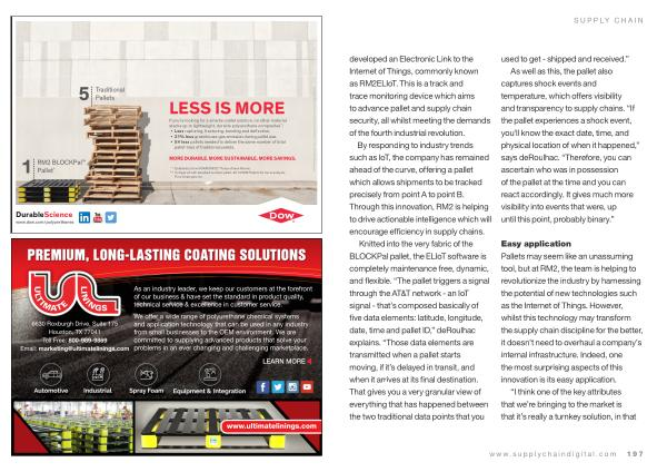 By responding to industry trends such as IoT , the company has remained ahead of the curve , offering a pallet which allows shipments to be tracked precisely from point A to point B . Through this innovation , RM2 is helping to drive actionable intelligence which will encourage efficiency in supply chains . Knitted into the very fabric of the BLOCKPal pallet , the ELIoT software is completely maintenance free , dynamic , and flexible . “ The pallet triggers a signal through the AT & T network - an IoT signal - that ’ s composed basically of five data elements : latitude , longitude , date , time and pallet ID ,” deRoulhac explains . “ Those data elements are transmitted when a pallet starts moving , if it ’ s delayed in transit , and when it arrives at its final destination . That gives you a very granular view of everything that has happened between the two traditional data points that you used to get - shipped and received .”