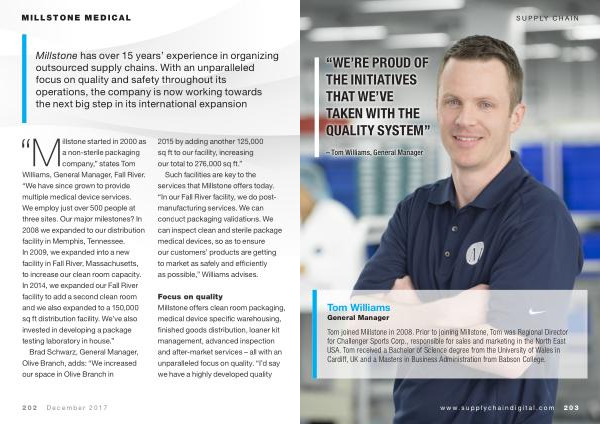 Millstone started in 2000 as a non-sterile packaging company ,” states Tom Williams , General Manager , Fall River . “ We have since grown to provide multiple medical device services . We employ just over 500 people at three sites . Our major milestones ? In 2008 we expanded to our distribution facility in Memphis , Tennessee . In 2009 , we expanded into a new facility in Fall River , Massachusetts , to increase our clean room capacity . In 2014 , we expanded our Fall River facility to add a second clean room and we also expanded to a 150,000 sq ft distribution facility . We ’ ve also invested in developing a package testing laboratory in house .”