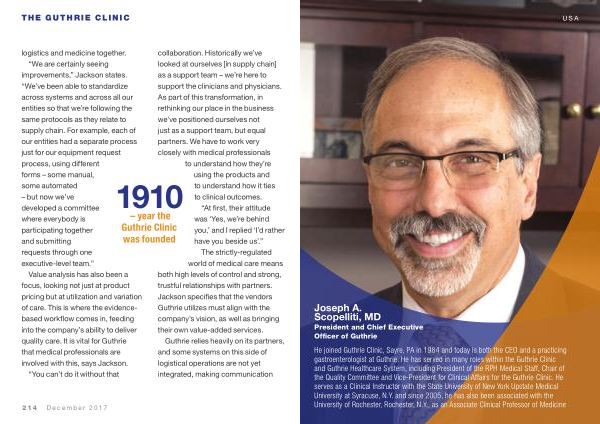 He joined Guthrie Clinic , Sayre , PA in 1984 and today is both the CEO and a practicing gastroenterologist at Guthrie . He has served in many roles within the Guthrie Clinic and Guthrie Healthcare System , including President of the RPH Medical Staff , Chair of the Quality Committee and Vice-President for Clinical Affairs for the Guthrie Clinic . He serves as a Clinical Instructor with the State University of New York Upstate Medical University at Syracuse , N . Y . and since 2005 , he has also been associated with the University of Rochester , Rochester , N . Y ., as an Associate Clinical Professor of Medicine