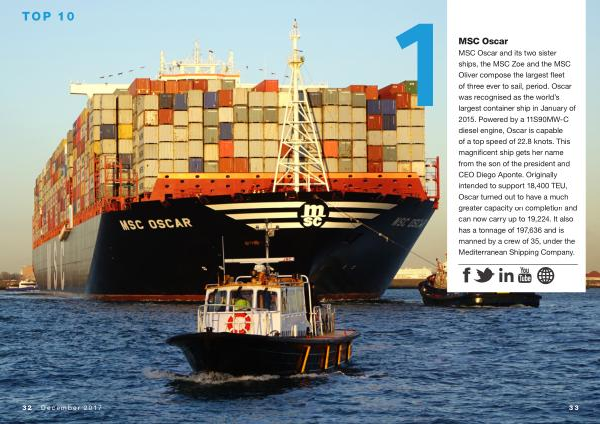 MSC Oscar and its two sister ships , the MSC Zoe and the MSC Oliver compose the largest fleet of three ever to sail , period . Oscar was recognised as the world ’ s largest container ship in January of 2015 . Powered by a 11S90MW-C diesel engine , Oscar is capable of a top speed of 22.8 knots . This magnificent ship gets her name from the son of the president and CEO Diego Aponte . Originally intended to support 18,400 TEU , Oscar turned out to have a much greater capacity on completion and can now carry up to 19,224 . It also has a tonnage of 197,636 and is manned by a crew of 35 , under the Mediterranean Shipping Company . 33