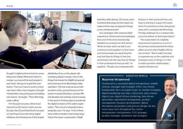 For the past two years , Stramrood has built an 80-person team across Europe , the US and Asia Pacific focused on starting and accelerating digital initiatives , and infusing one of the largest distribution firms on the planet with sweeping digital change . One of the things that makes the DigiB hub special is its autonomy from Brenntag ’ s wider operation . The hub is set up as an independent entity , giving Stramrood the power to expand his team , oversee HR and develop new policies and processes in the name of finding ways to accelerate the digital evolution of the wider organisation . “ Not a lot of companies have a setup like ours ,” he says . “ A lot of them have a little innovation hub tucked away inside the larger organisation . DigiB