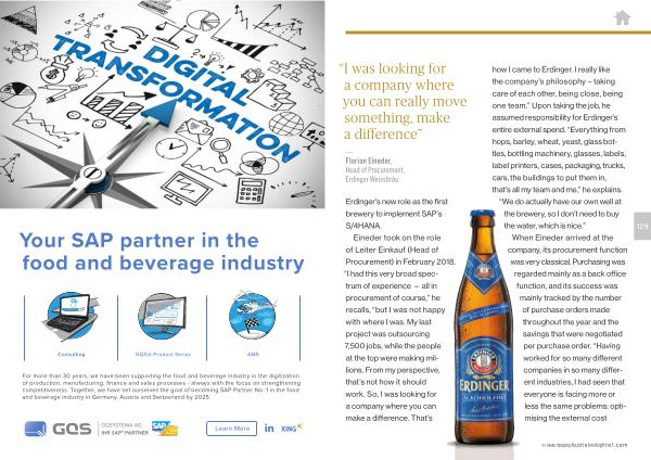 Erdinger ’ s new role as the first brewery to implement SAP ’ s S / 4HANA . Eineder took on the role of Leiter Einkauf ( Head of Procurement ) in February 2018 . “ I had this very broad spectrum of experience — all in procurement of course ,” he recalls , “ but I was not happy with where I was . My last project was outsourcing 7,500 jobs , while the people at the top were making millions . From my perspective , that ’ s not how it should work . So , I was looking for a company where you can make a difference . That ’ s how I came to Erdinger . I really like the company ’ s philosophy – taking care of each other , being close , being one team .” Upon taking the job , he assumed responsibility for Erdinger ’ s entire external spend . “ Everything from hops , barley , wheat , yeast , glass bottles , bottling machinery , glasses , labels , label printers , cases , packaging , trucks , cars , the buildings to put them in , that ’ s all my team and me ,” he explains . “ We do actually have our own well at the brewery , so I don ’ t need to buy the water , which is nice .” When Eineder arrived at the company , its procurement function was very classical . Purchasing was regarded mainly as a back office function , and its success was mainly tracked by the number of purchase orders made throughout the year and the savings that were negotiated per purchase order . “ Having worked for so many different companies in so many different industries , I had seen that everyone is facing more or less the same problems : optimising the external cost