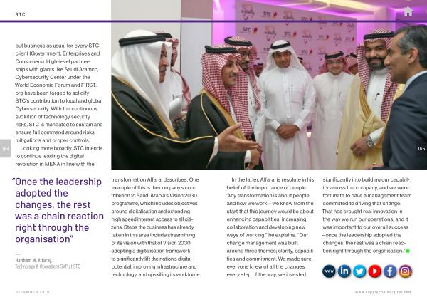 — Haithem M . Alfaraj , Technology & Operations SVP at STC transformation Alfaraj describes . One example of this is the company ’ s contribution to Saudi Arabia ’ s Vision 2030 programme , which includes objectives around digitalisation and extending high speed internet access to all citizens . Steps the business has already taken in this area include streamlining of its vision with that of Vision 2030 , adopting a digitalisation framework to significantly lift the nation ’ s digital potential , improving infrastructure and technology , and upskilling its workforce .