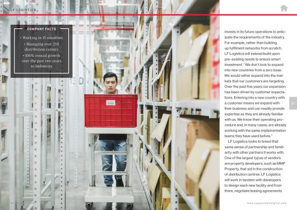 invests in its future operations to anticipate the requirements of the industry . For example , rather than building up fulfilment networks from scratch , LF Logistics will instead build upon pre-existing needs to ensure smart investment . “ We don ’ t look to expand into new countries from a zero base . We would rather expand into the markets that our customers are targeting . Over the past five years our expansion has been driven by customer expectations . Entering into a new country with a customer means we expand with their business and can readily provide expertise as they are already familiar with us . We know their operating procedure and , in many cases , are already working with the same implementation teams they have used before .”