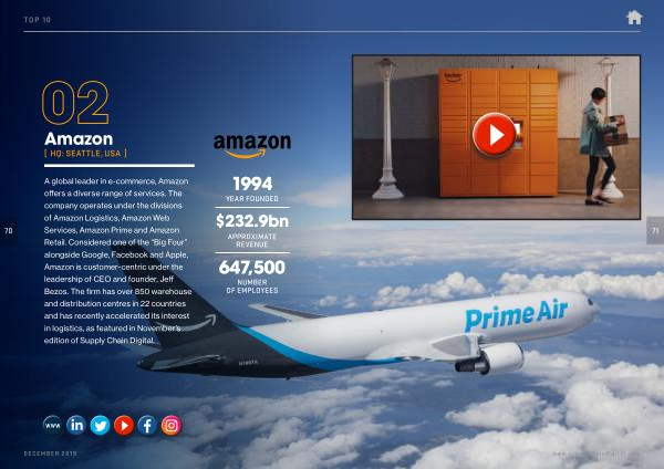 A global leader in e-commerce , Amazon offers a diverse range of services . The company operates under the divisions of Amazon Logistics , Amazon Web Services , Amazon Prime and Amazon Retail . Considered one of the “ Big Four ” alongside Google , Facebook and Apple , Amazon is customer-centric under the leadership of CEO and founder , Jeff Bezos . The firm has over 850 warehouse and distribution centres in 22 countries and has recently accelerated its interest in logistics , as featured in November ’ s edition of Supply Chain Digital .
