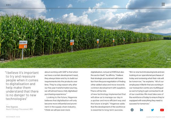 — Peter Hagenow , Head of Strategic Procurement , KWS about working with SAP is that when we have a certain development need , they always listen and try to build our requirements into the products over time . They ’ re a big reason why after our five year transformation journey , we will almost have a fully digitalised purchasing experience .”