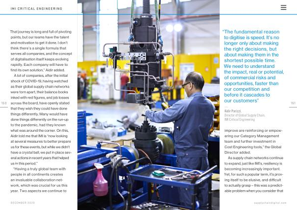 A lot of companies , after the initial shock of COVID-19 , having watched as their global supply chain networks were torn apart , their balance books inked with red figures , and job losses across the board , have openly stated that they wish they could have done things differently . Many would have done things differently on the run-up to the pandemic , had they known what was around the corner . On this , Aidir told me that IMI is “ now looking at several measures to better prepare us for these events , but while we didn ’ t have a crystal ball , we put in place several actions in recent years that helped us in this period .”