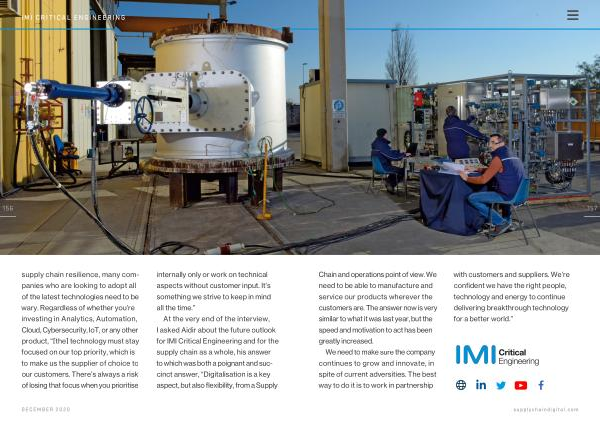 At the very end of the interview , I asked Aidir about the future outlook for IMI Critical Engineering and for the supply chain as a whole , his answer to which was both a poignant and succinct answer , “ Digitalisation is a key aspect , but also flexibility , from a Supply