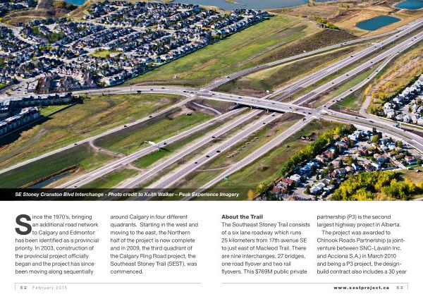 About the Trail The Southeast Stoney Trail consists of a six lane roadway which runs 25 kilometers from 17th avenue SE to just east of Macleod Trail . There are nine interchanges , 27 bridges , one road flyover and two rail flyovers . This $ 769M public private partnership ( P3 ) is the second largest highway project in Alberta . The project was awarded to Chinook Roads Partnership ( a jointventure between SNC-Lavalin Inc . and Acciona S . A .) in March 2010 and being a P3 project , the designbuild contract also includes a 30 year