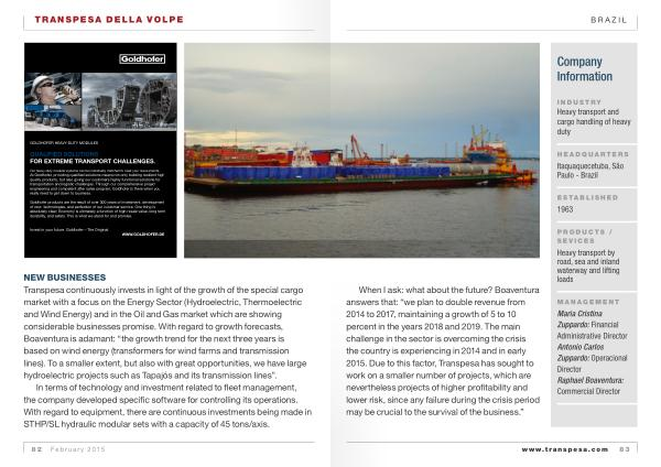 When I ask : what about the future ? Boaventura answers that : “ we plan to double revenue from 2014 to 2017 , maintaining a growth of 5 to 10 percent in the years 2018 and 2019 . The main challenge in the sector is overcoming the crisis the country is experiencing in 2014 and in early 2015 . Due to this factor , Transpesa has sought to work on a smaller number of projects , which are nevertheless projects of higher profitability and lower risk , since any failure during the crisis period may be crucial to the survival of the business .”