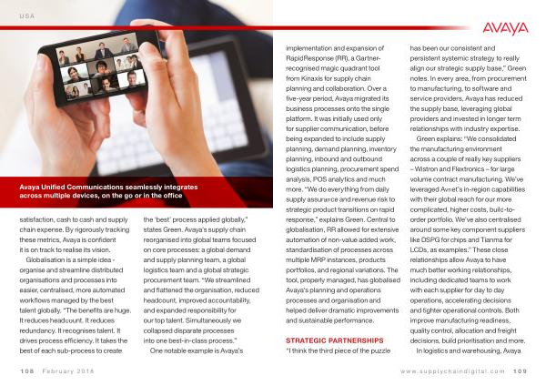 Green explains : “ We consolidated the manufacturing environment across a couple of really key suppliers – Wistron and Flextronics – for large volume contract manufacturing . We ’ ve leveraged Avnet ’ s in-region capabilities with their global reach for our more complicated , higher costs , build-toorder portfolio . We ’ ve also centralised around some key component suppliers like DSPG for chips and Tianma for LCDs , as examples .” These close relationships allow Avaya to have much better working relationships , including dedicated teams to work with each supplier for day to day operations , accelerating decisions and tighter operational controls . Both improve manufacturing readiness , quality control , allocation and freight decisions , build prioritisation and more .