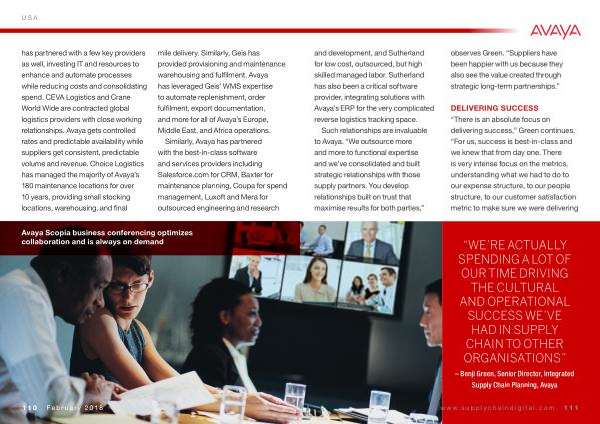 has partnered with a few key providers as well , investing IT and resources to enhance and automate processes while reducing costs and consolidating spend . CEVA Logistics and Crane World Wide are contracted global logistics providers with close working relationships . Avaya gets controlled rates and predictable availability while suppliers get consistent , predictable volume and revenue . Choice Logistics has managed the majority of Avaya ’ s 180 maintenance locations for over 10 years , providing small stocking locations , warehousing , and final mile delivery . Similarly , Geis has provided provisioning and maintenance warehousing and fulfilment . Avaya has leveraged Geis ’ WMS expertise to automate replenishment , order fulfilment , export documentation , and more for all of Avaya ’ s Europe , Middle East , and Africa operations .