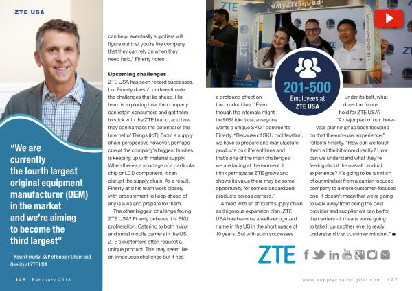 Upcoming challenges ZTE USA has seen record successes , but Finerty doesn ’ t underestimate the challenges that lie ahead . His team is exploring how the company can retain consumers and get them to stick with the ZTE brand , and how they can harness the potential of the Internet of Things ( IoT ). From a supply chain perspective however , perhaps one of the company ’ s biggest hurdles is keeping up with material supply . When there ’ s a shortage of a particular chip or LCD component , it can disrupt the supply chain . As a result , Finerty and his team work closely with procurement to keep ahead of any issues and prepare for them .