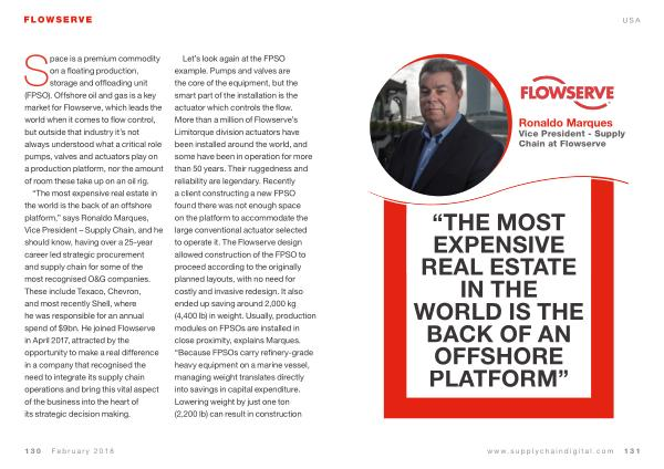 “ The most expensive real estate in the world is the back of an offshore platform ,” says Ronaldo Marques , Vice President – Supply Chain , and he should know , having over a 25-year career led strategic procurement and supply chain for some of the most recognised O & G companies . These include Texaco , Chevron , and most recently Shell , where he was responsible for an annual spend of $ 9bn . He joined Flowserve in April 2017 , attracted by the opportunity to make a real difference in a company that recognised the need to integrate its supply chain operations and bring this vital aspect of the business into the heart of its strategic decision making .