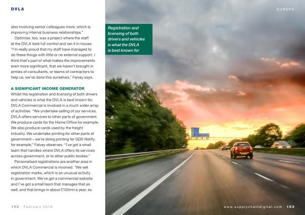 A SIGNIFICANT INCOME GENERATOR Whilst the registration and licensing of both drivers and vehicles is what the DVLA is best known for , DVLA Commercial is involved in a much wider array of activities . “ We undertake selling of our services . DVLA offers services to other parts of government . We produce cards for the Home Office for example . We also produce cards used by the freight industry . We undertake printing for other parts of government – we ’ re doing printing for GDS Notify , for example ,” Falvey observes . “ I ’ ve got a small team that handles where DVLA offers its services across government , or to other public bodies .”