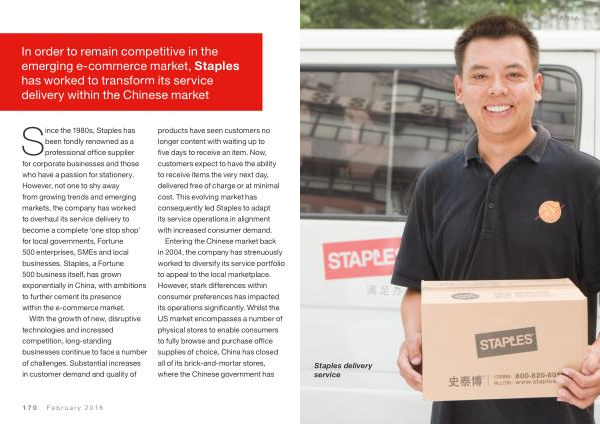Since the 1980s , Staples has been fondly renowned as a professional office supplier for corporate businesses and those who have a passion for stationery . However , not one to shy away from growing trends and emerging markets , the company has worked to overhaul its service delivery to become a complete ‘ one stop shop ’ for local governments , Fortune 500 enterprises , SMEs and local businesses . Staples , a Fortune 500 business itself , has grown exponentially in China , with ambitions to further cement its presence within the e-commerce market .