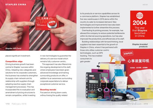Competitive edge Driving business growth has been central to Staples ’ success within China . Adopting new categories and solutions for its corporate customers , the business has worked to strengthen its supply chain network and its relationship with suppliers through adopting reactive supply chain management processes . This has incorporated the re-evaluation and amendment of pricing structures to remain competitive , whilst investing in new technologies to guarantee the delivery of a service model which remains fully customer-centric .